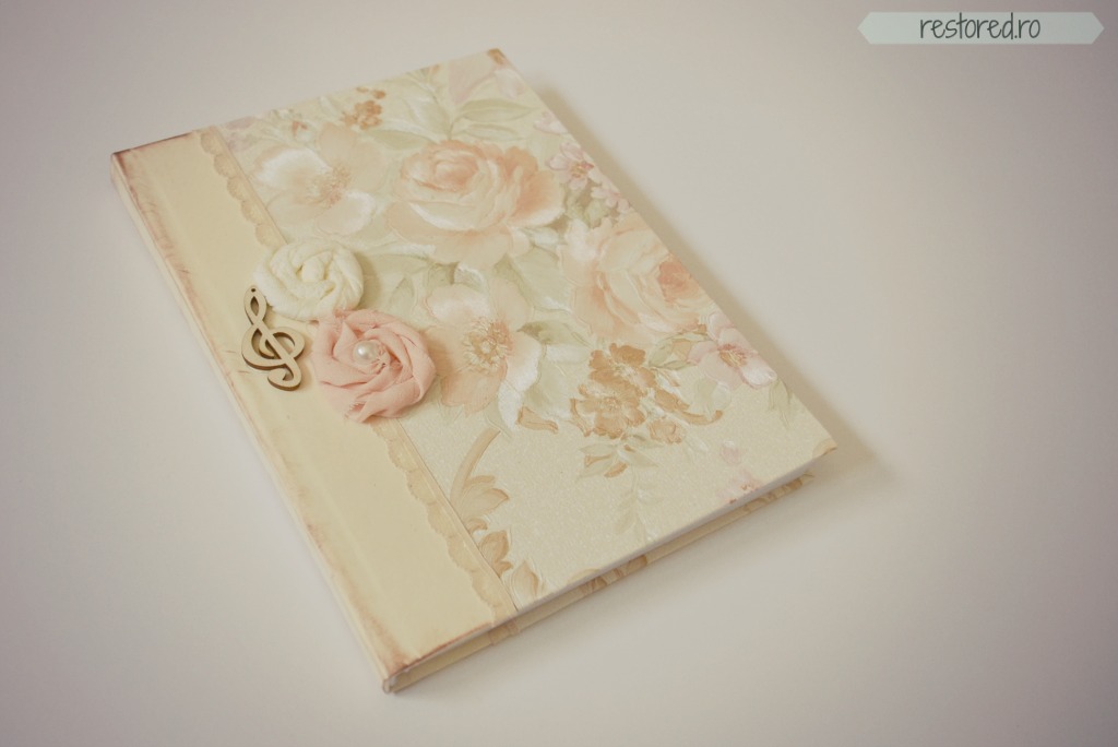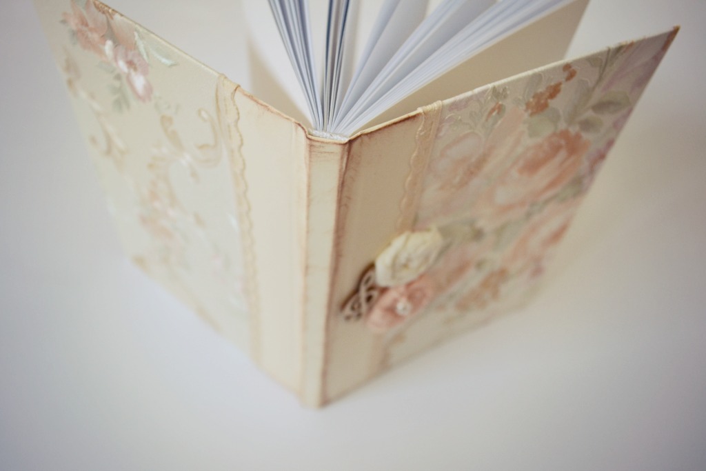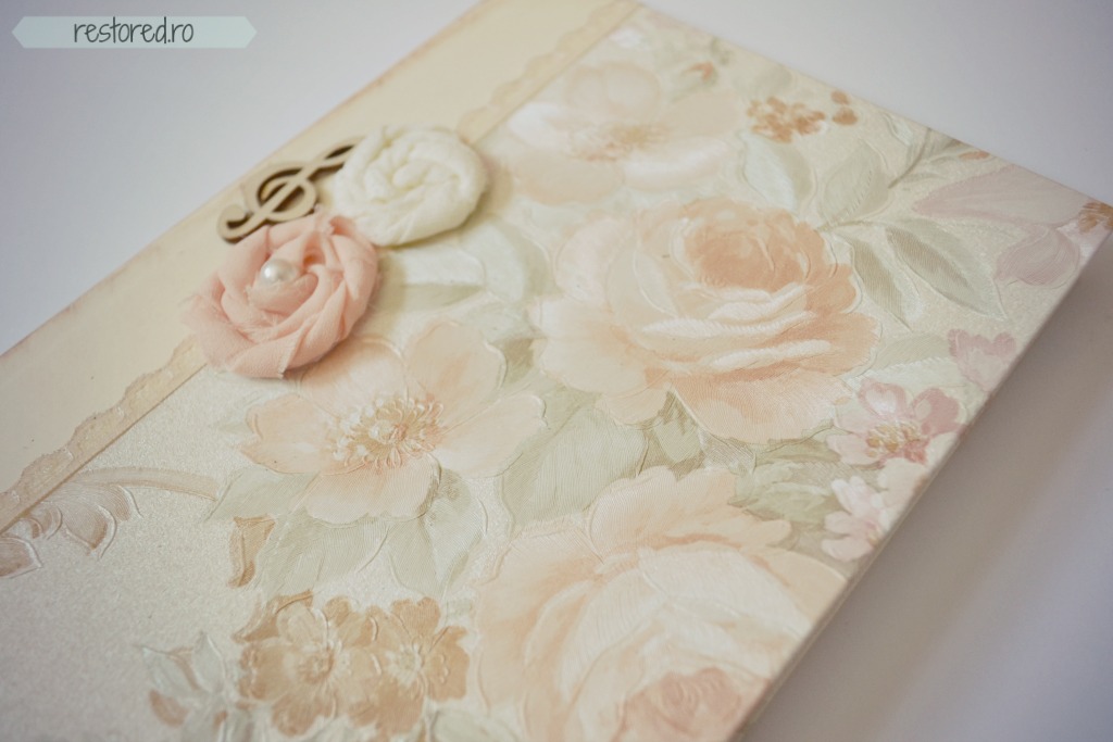 Mi-a facut mare placere sa folosesc hartia aceasta texturata care mi-a ramas de la o comanda mai veche, de la nunta Dianei si a lui Cipri, iar bucatile mai mici le-am mai folosit la alte comenzi. Anul asta foarte mult s-a mers pe culori pale, sterse, pe ivory, roz prafuit, auriu… Cutia de bani si guesbook-ul sunt doar un exemplu din multele combinatii posibile.