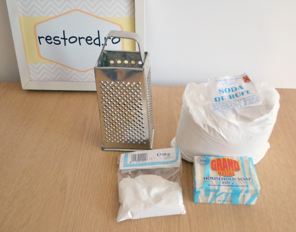 Toata afacerea asta m-a costat asa: un sapun de 200 g – 2 lei, 1 kg soda de rufe – 4 lei, 100 g bicarbonat de sodiu – 0.75 lei.